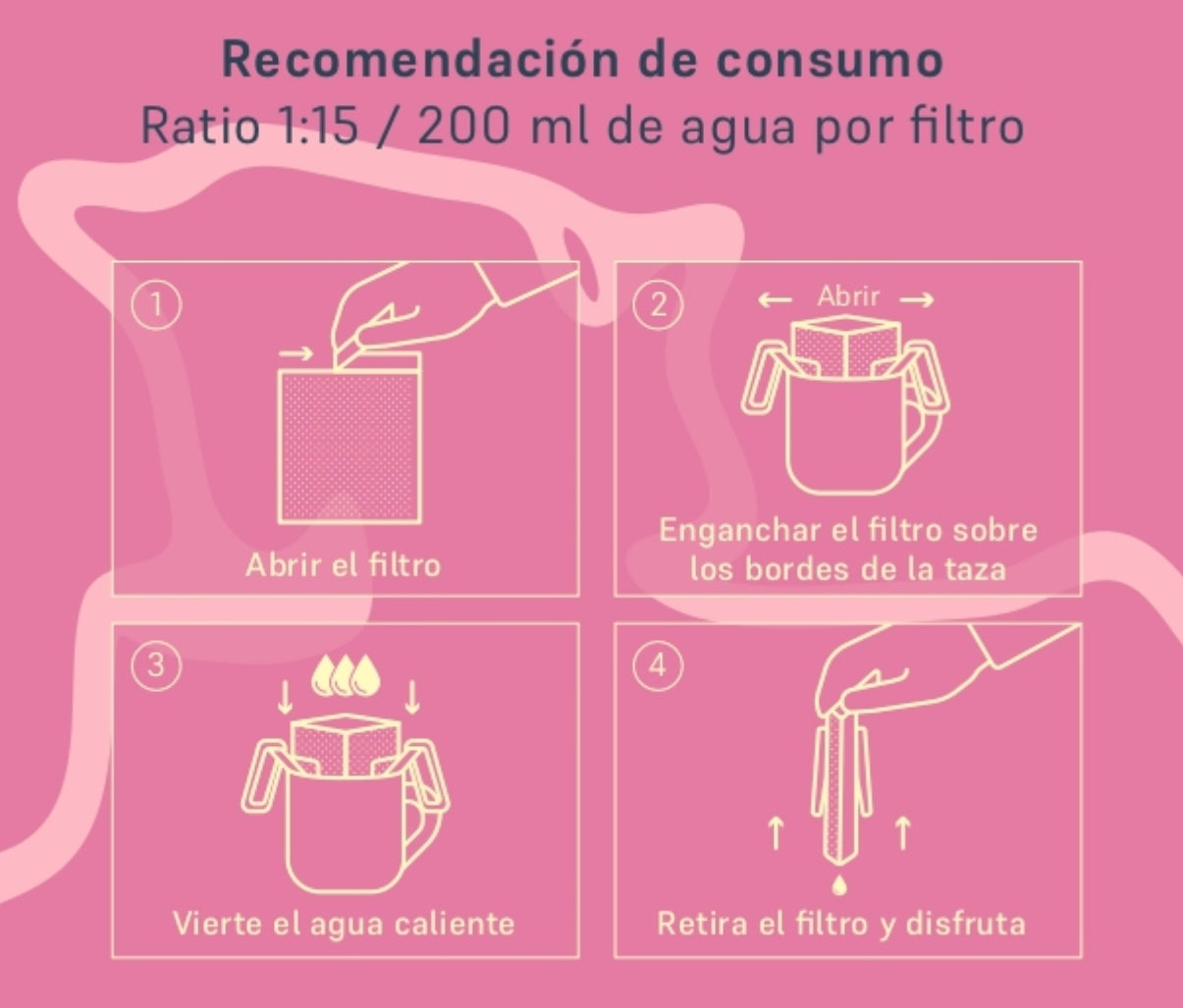 Preparación básica: Verter agua caliente en el filtro hasta el borde, esperar a que decante el agua y repetir el proceso hasta completar el volumen deseado. En este caso se aconseja un volumen de entre 195 - 200 g de agua. Si deseas una extracción con más cuerpo y amargor puedes dejar reposando el filtro en contacto con el agua hasta 5 minutos.